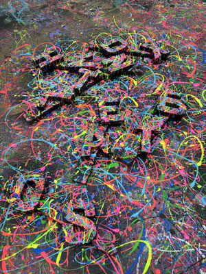 Experimental techniques from the field of action painting/drip painting are continually reflected in her artworks. Single letters or words that are