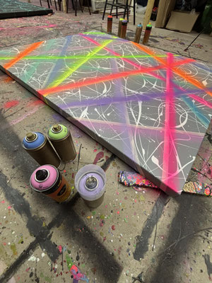 The artist uses the entire color spectrum of acrylic paints for her abstract artworks. Nicole primarily plays with bold, bright (neon) colors, but muted pastels or black-and-white contrasts are also occasionally used. Her current color choices are intuitive—gut-driven—emotionally driven.